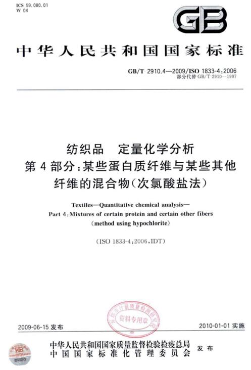 GB/T2910的本部分規(guī)定了采用次氯酸鹽法測定去除非纖維物質(zhì)后由以下纖維組成的某些蛋白質(zhì)纖維和某些非蛋白質(zhì)纖維二組分混合物中蛋白質(zhì)纖維含量的方法: